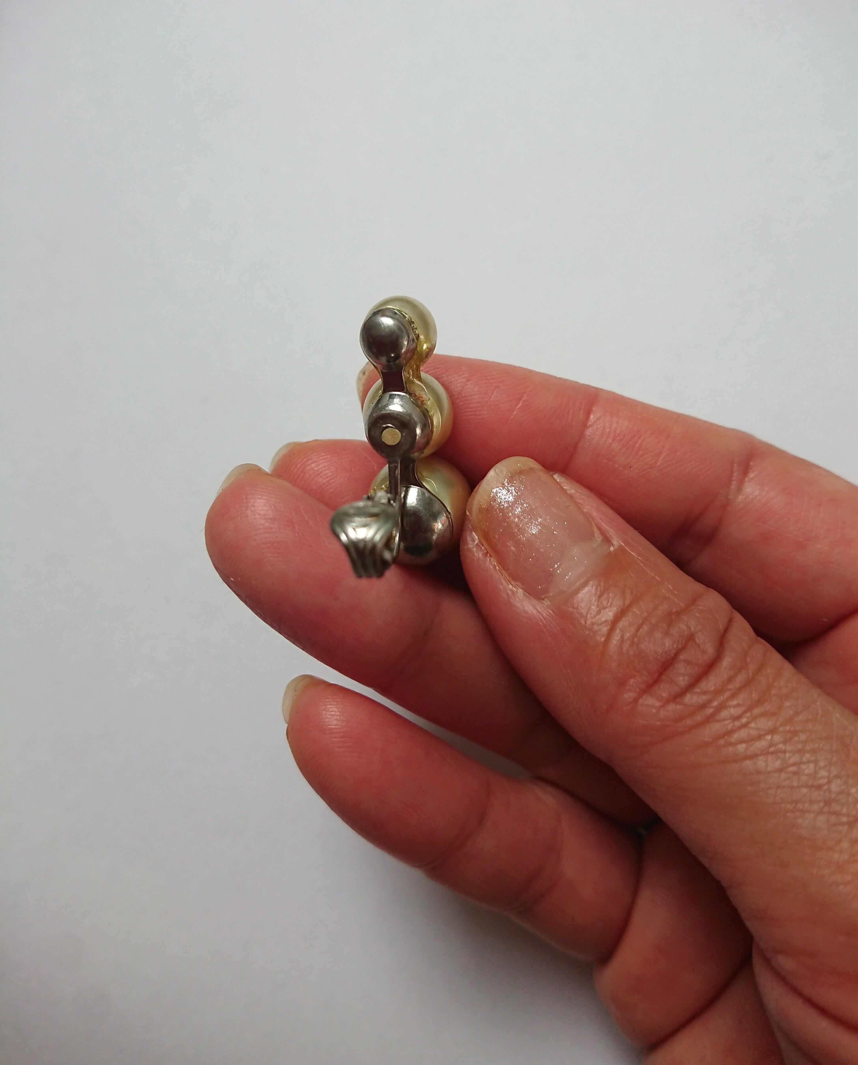 シルバーメタルにホワイトパールビーズが三連重なり合うデザインがとても素敵なイヤリングです。