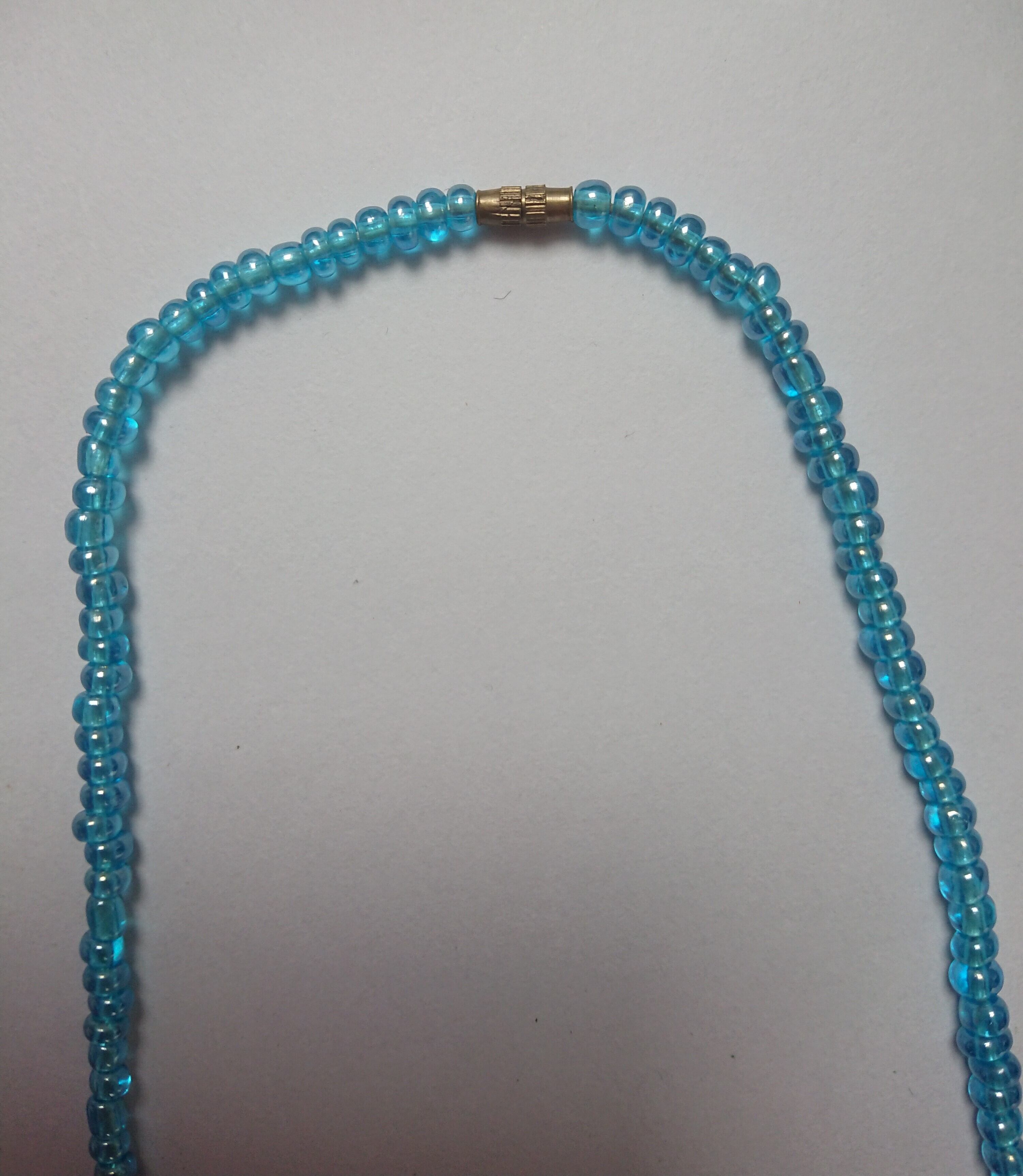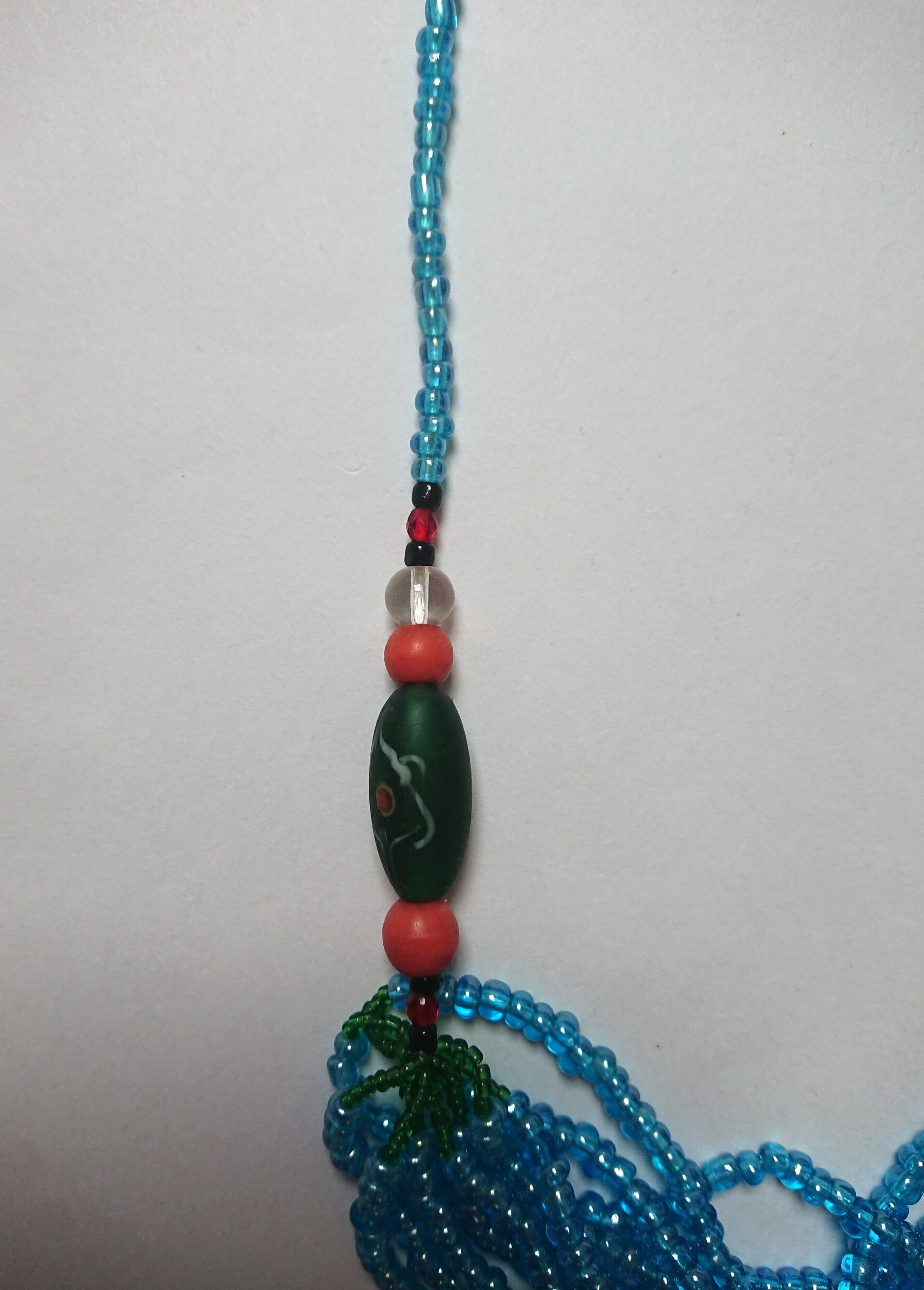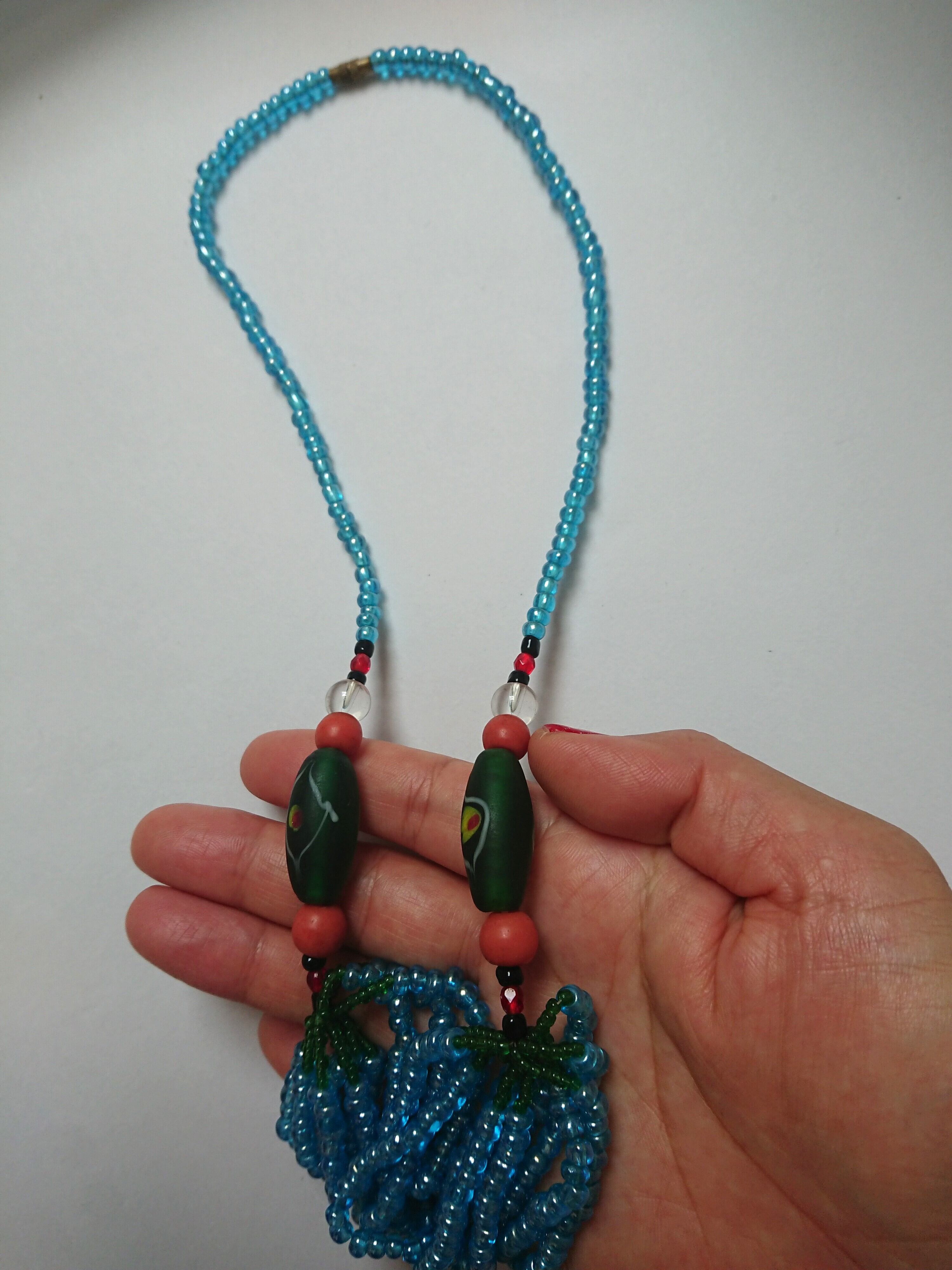 鮮やかな青、緑、ピンクのビーズが美しいネックレスです。