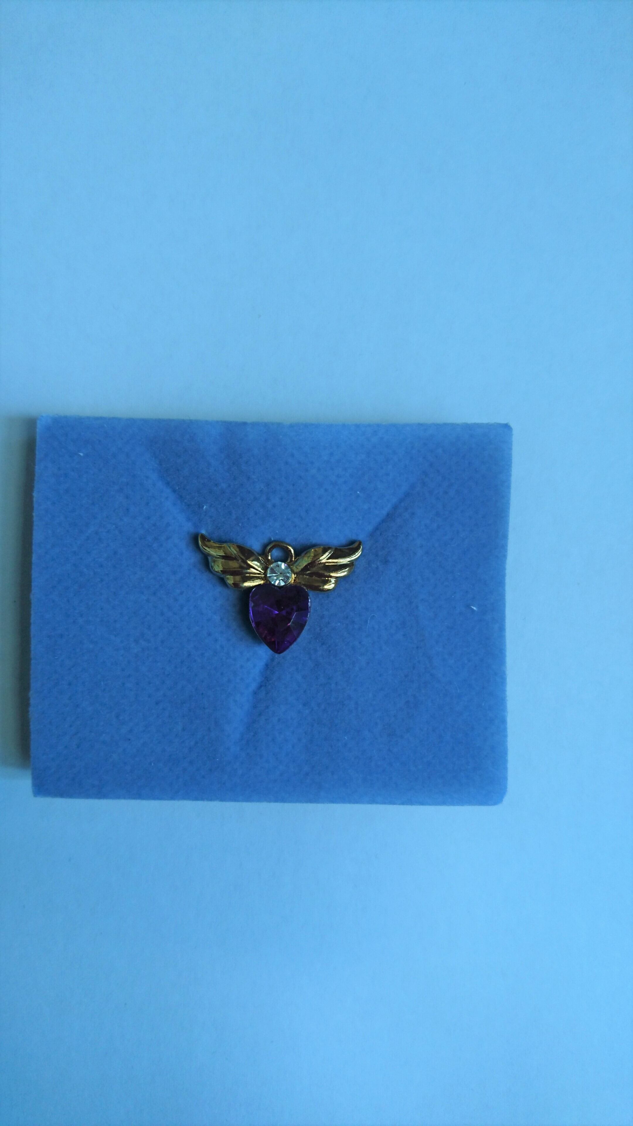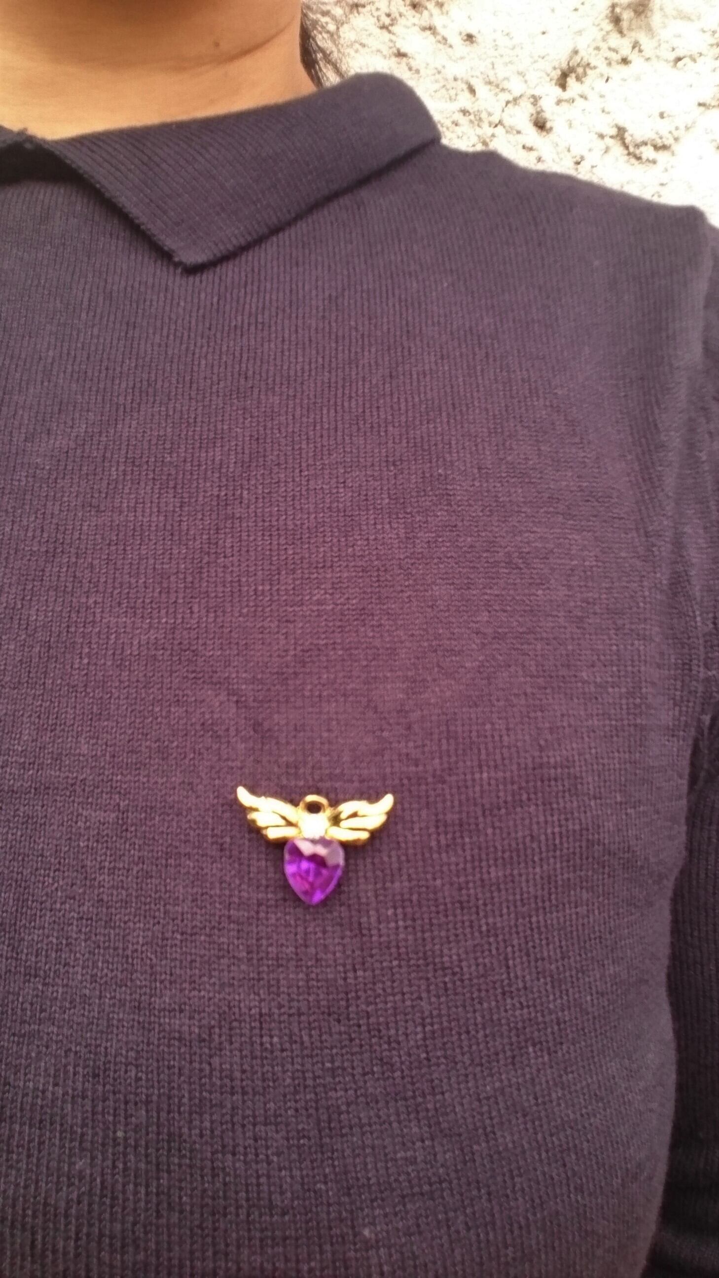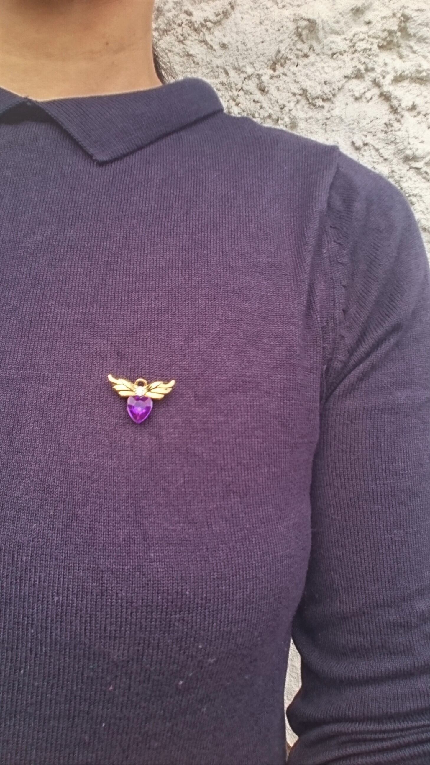 ゴールドメタルで紫色のハートに天使の羽がついているようなデザインが素敵なAVONのブローチです。