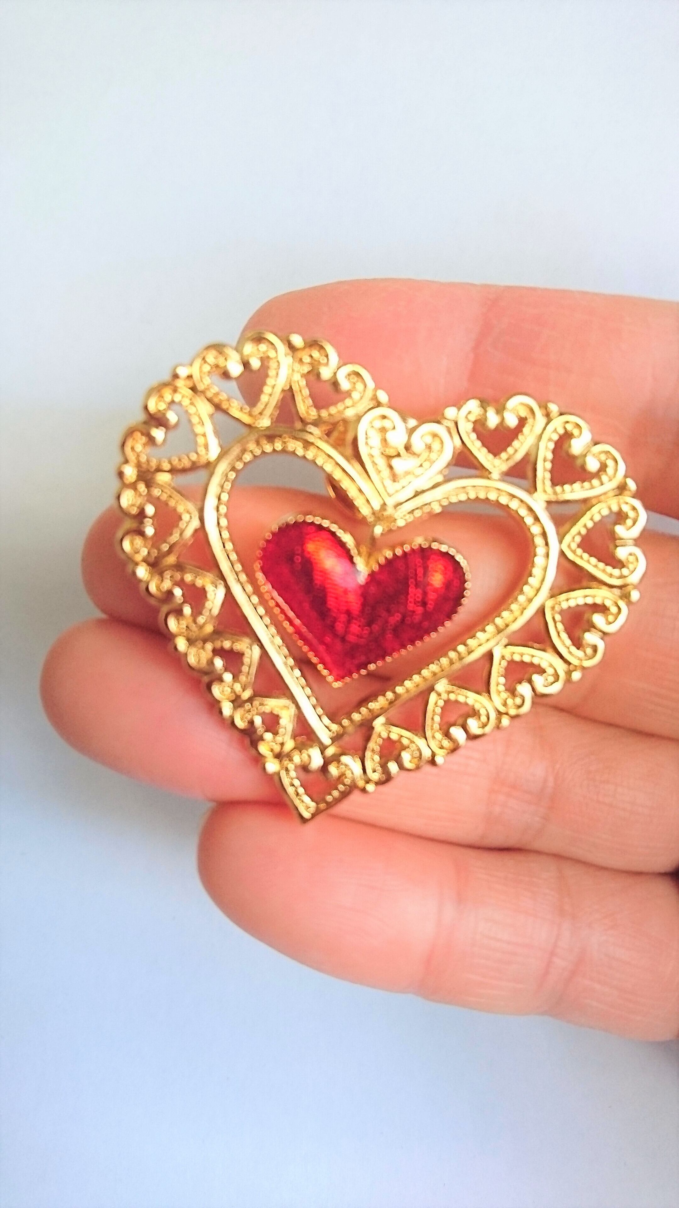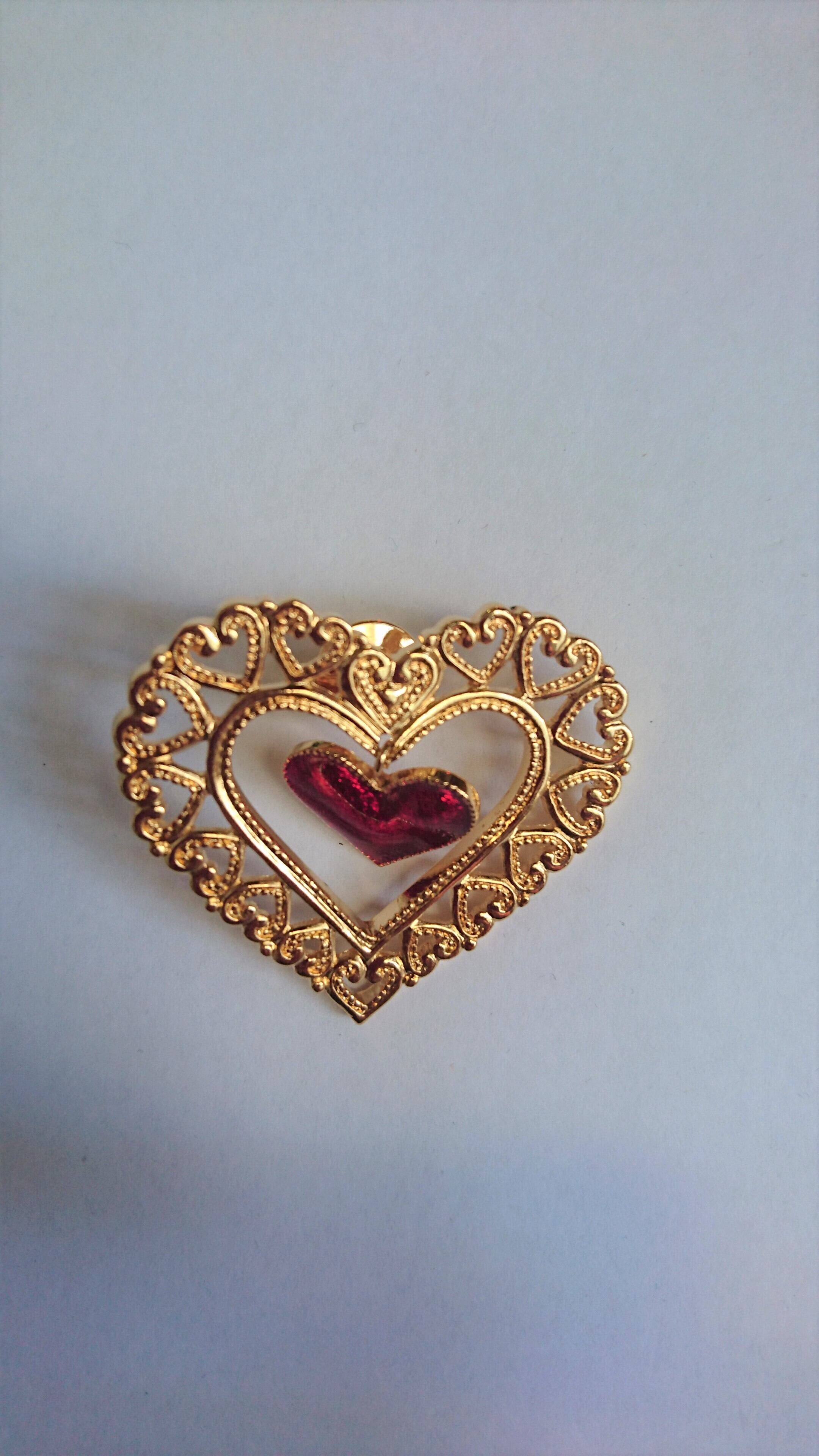 ゴールドメタルで赤いハートが揺れるデザインが素敵なAVONのブローチです。