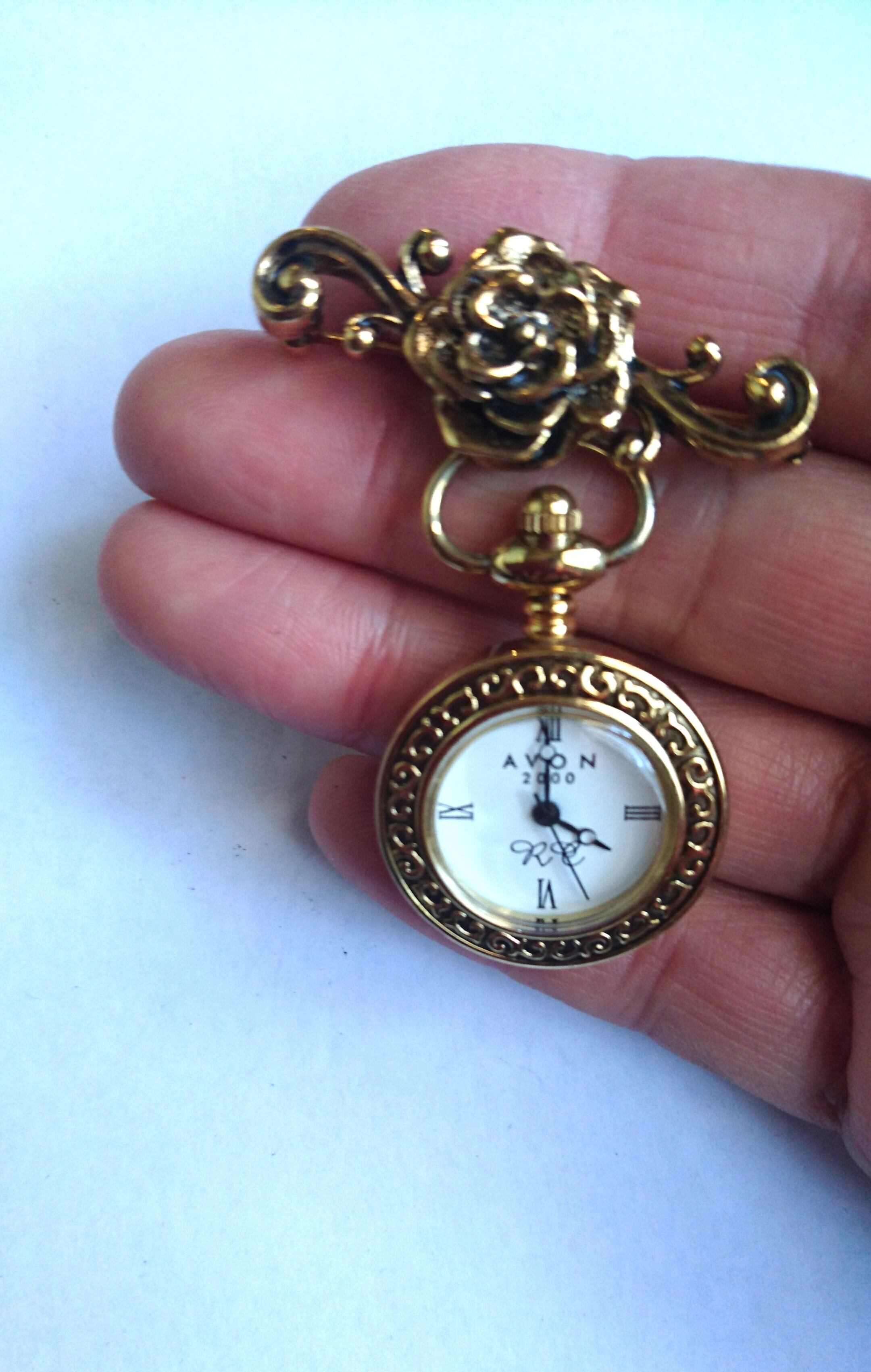 ゴールドのバラと時計が素敵なAVONのブローチです。