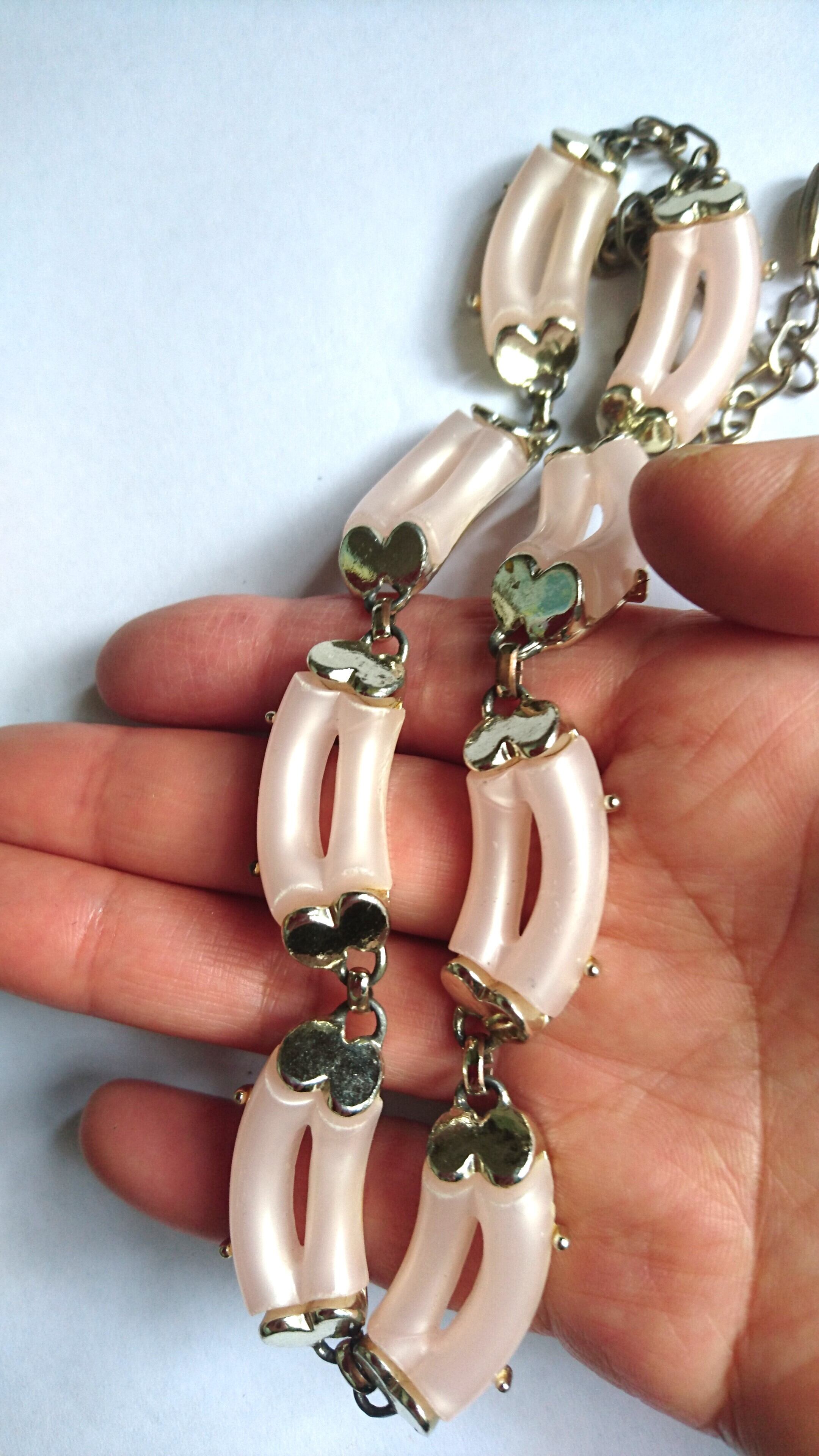 シルバーメタルにパステルピンク色のデザインが素敵なネックレスです。