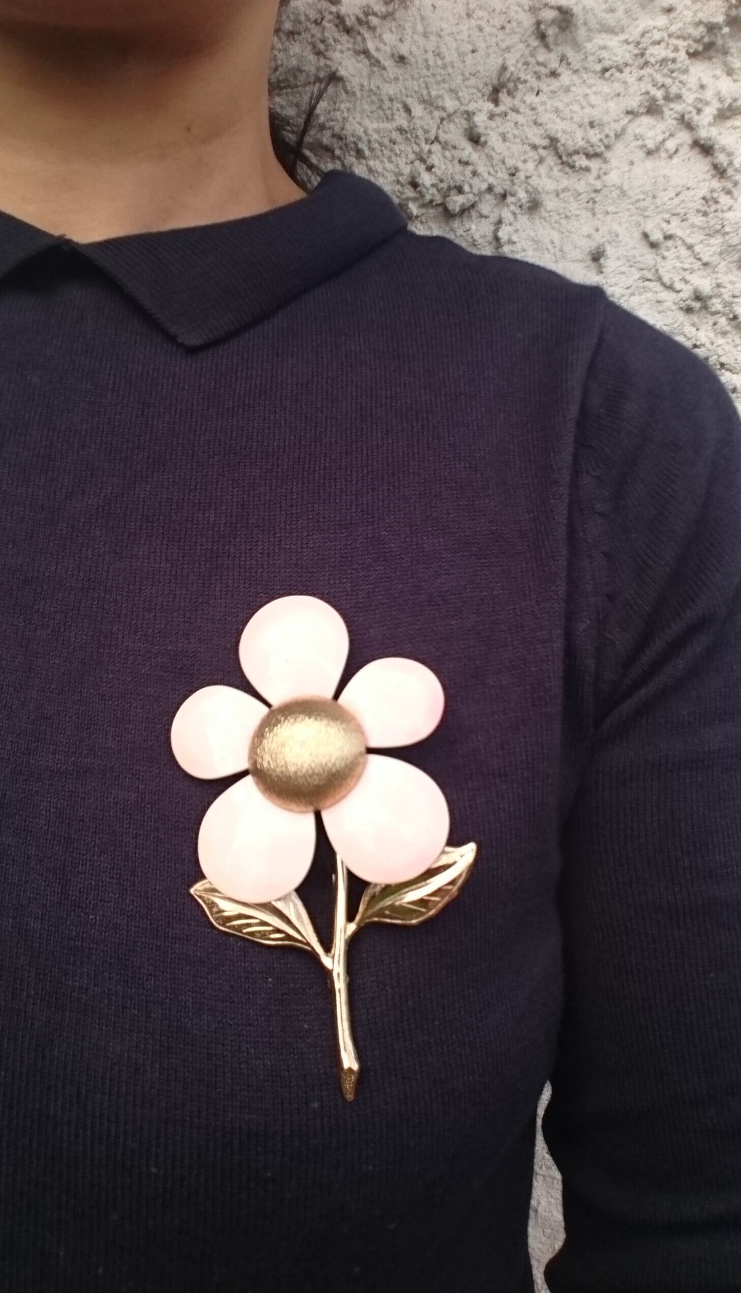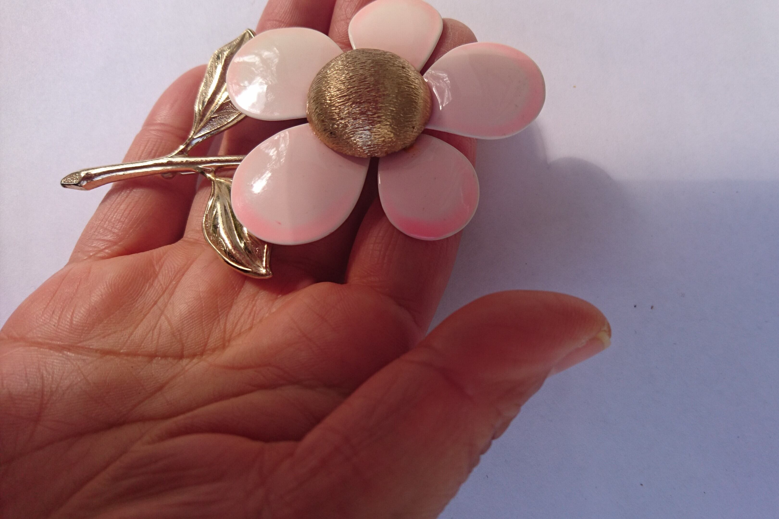 ゴールドメタルに薄いピンク色の大きなお花のデザインがとても素敵なSARAH COVENTRYのブローチです。