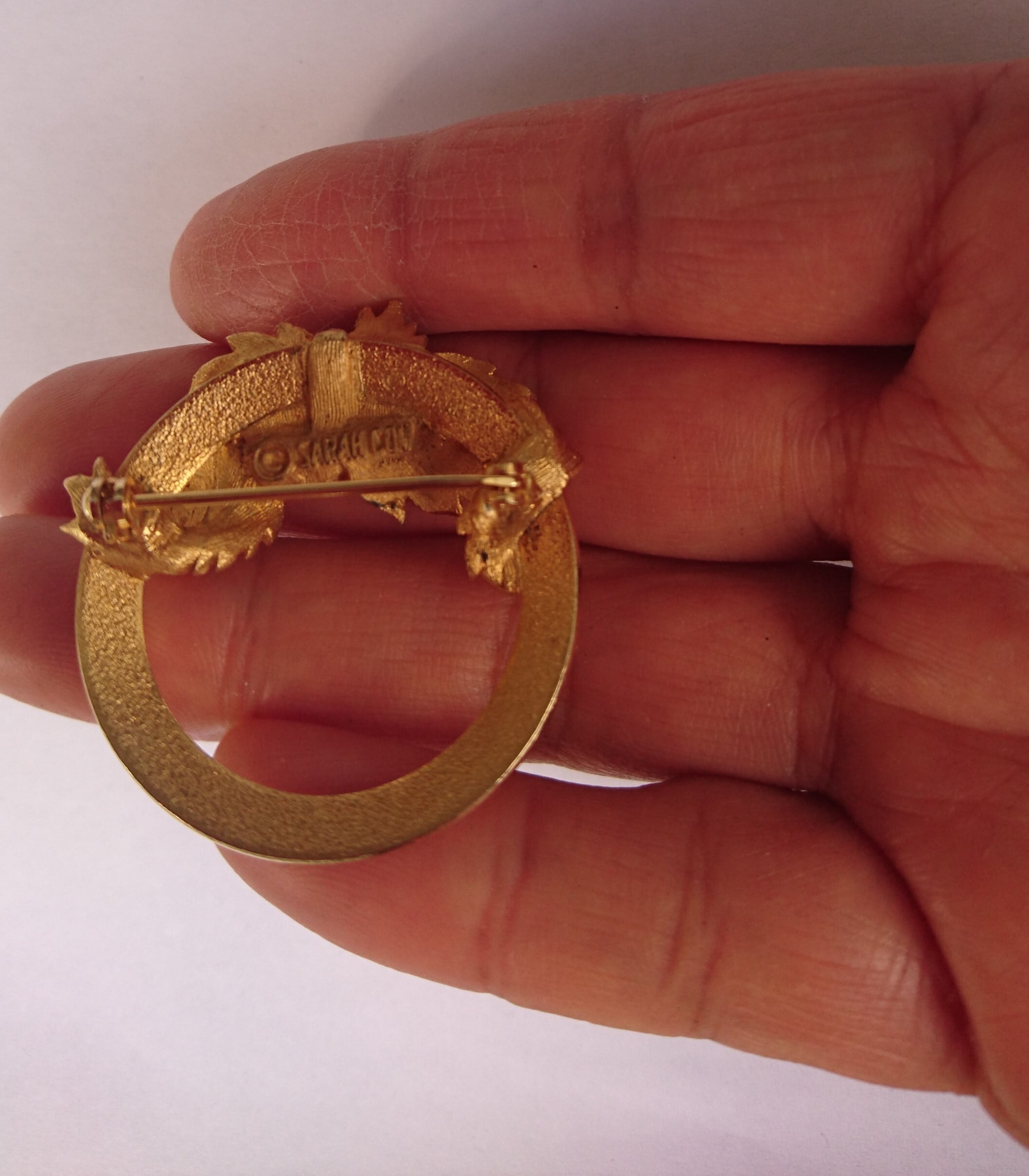 ゴールドメタルにリーフとパールビーズのデザインがとても素敵なSARAH COVENTRYのブローチです。